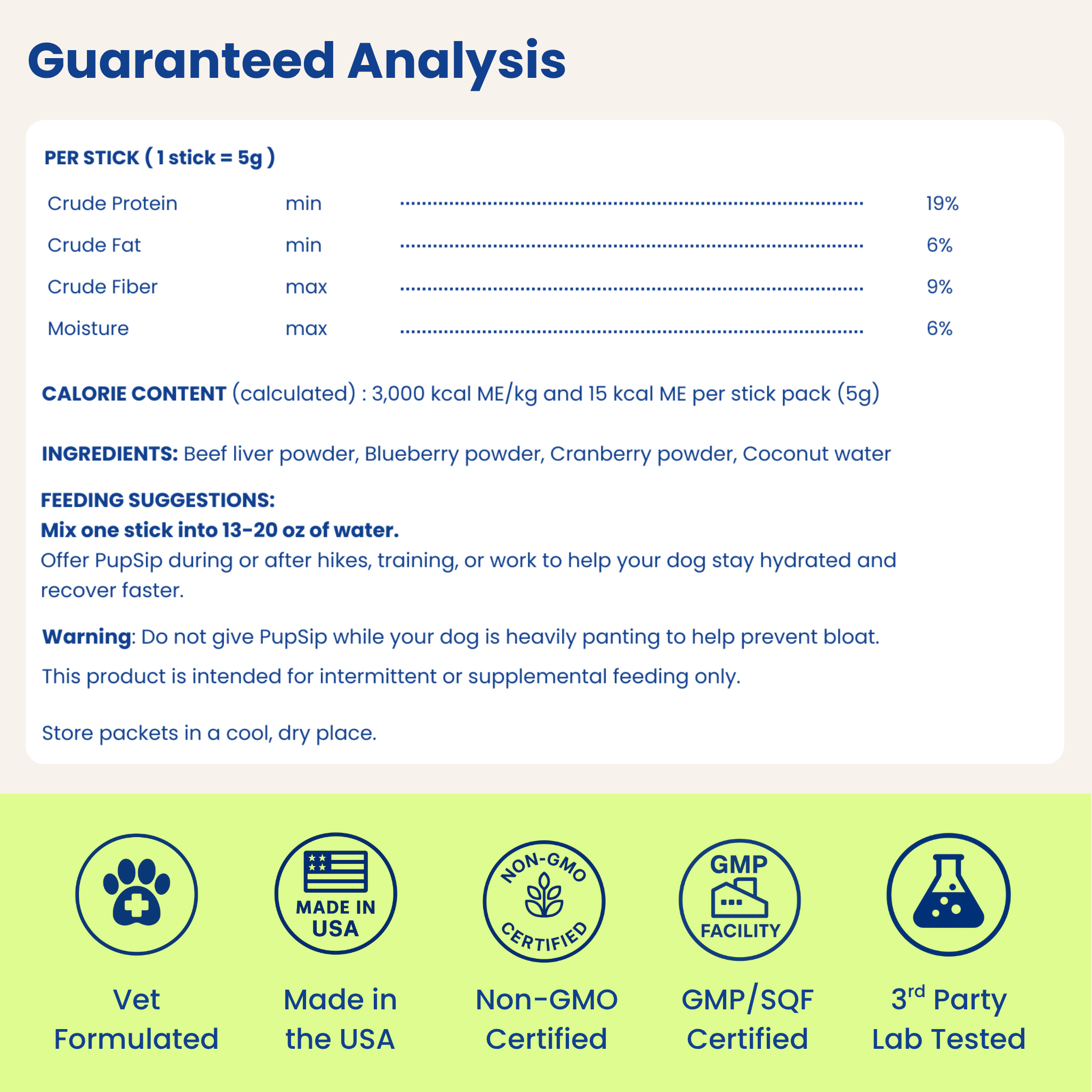 The Berry Boost flavor keeps picky drinkers interested, and the convenient stick packs make it easy to help your dog stay hydrated all the time. Safe for all breeds and life stages, PupSip is hydration made simple, functional, and ready when your dog needs it most.