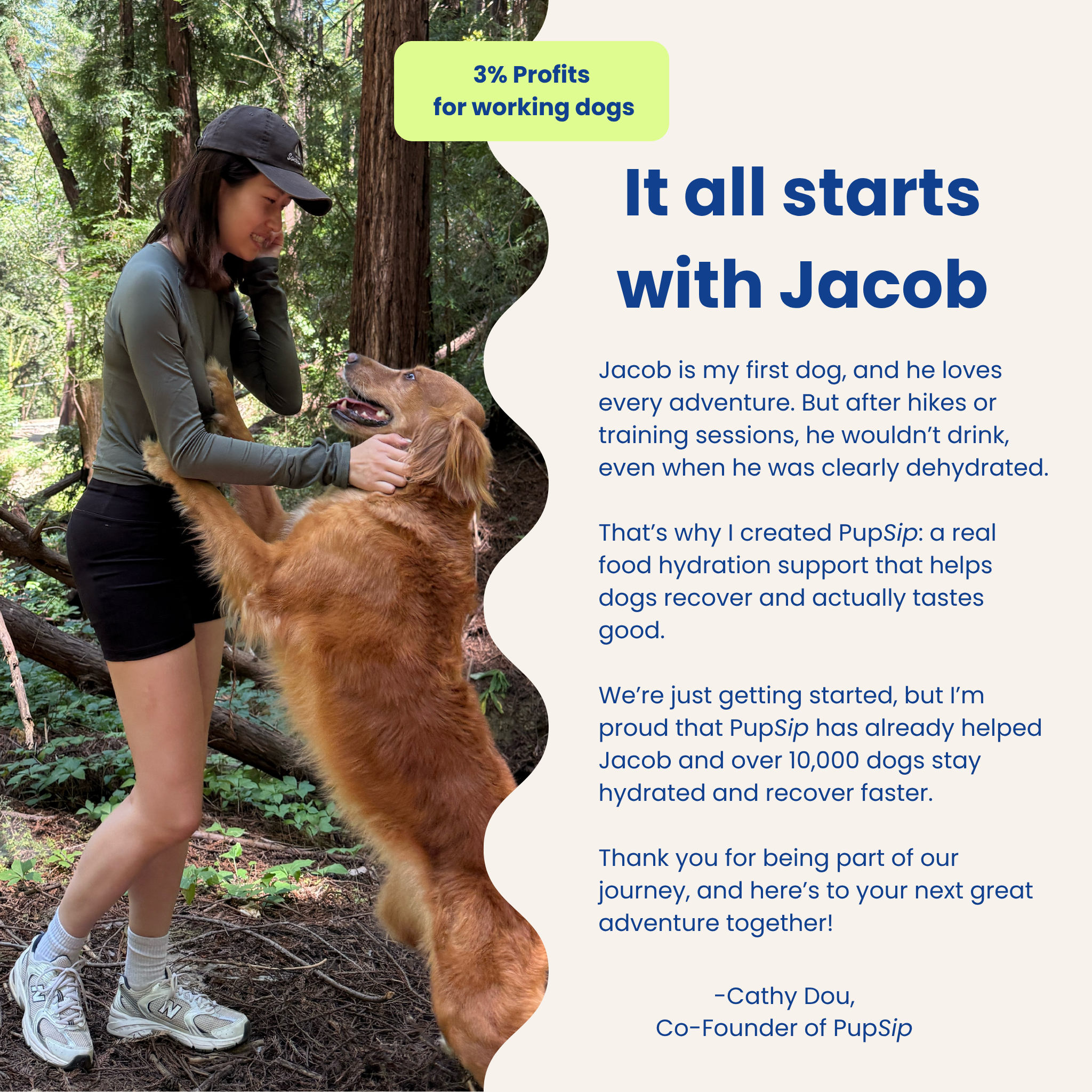 Berry Boost is a vet-formulated hydration support for dogs made with only 4 real-food ingredients, designed to support dogs in all the moments they need extra hydration. Whether your pup is dealing with diarrhea, recovering from surgery, traveling, aging, or adventuring outdoors, PupSip helps replenish essential fluids in a fast, gentle, and reliable way.
