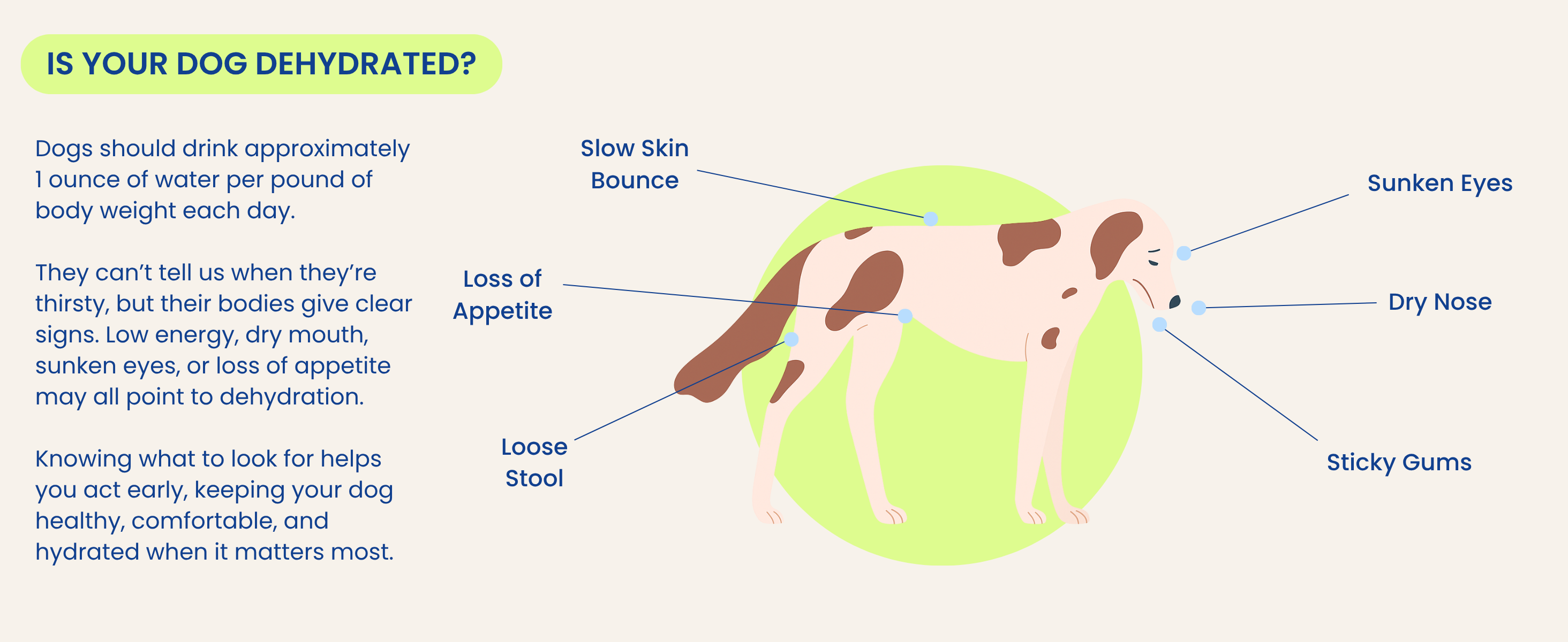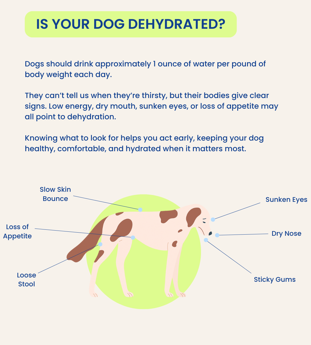 A dog needs approximately 1 ounce of water per pound of body weight per day. Many dogs drink less than their bodies require, especially during tummy upset, heat stress, aging, or recovery.